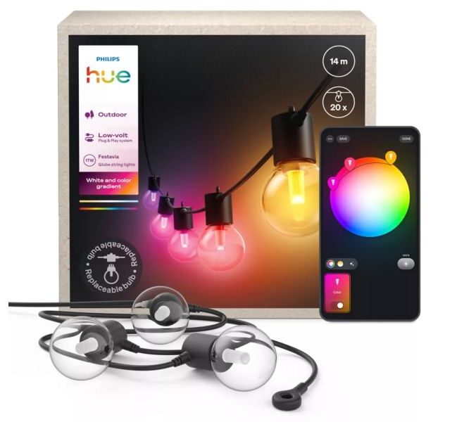 Zestaw Philips Hue Festavia + Hue Bridge Pro to propozycja dla osób, które chcą czegoś więcej niż dekoracyjnej girlandy. Jest to narzędzie do tworzenia klimatu, nastroju i profesjonalnych scen świetlnych w ogrodzie i na balkonie.